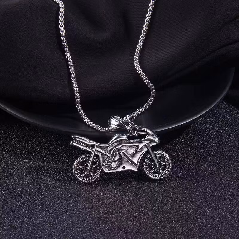 • Konstruktion: En robust pansarkedja i rostfritt stål som tål vardagens slitage, kombinerat med ett hänge i en metallegering (alloy) för att fånga varje liten detalj i motorcykelns design – från motorblocket till hjulen.