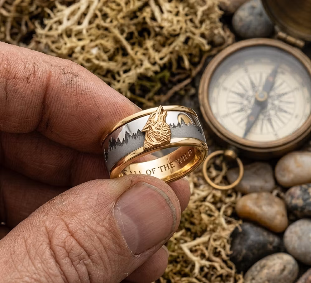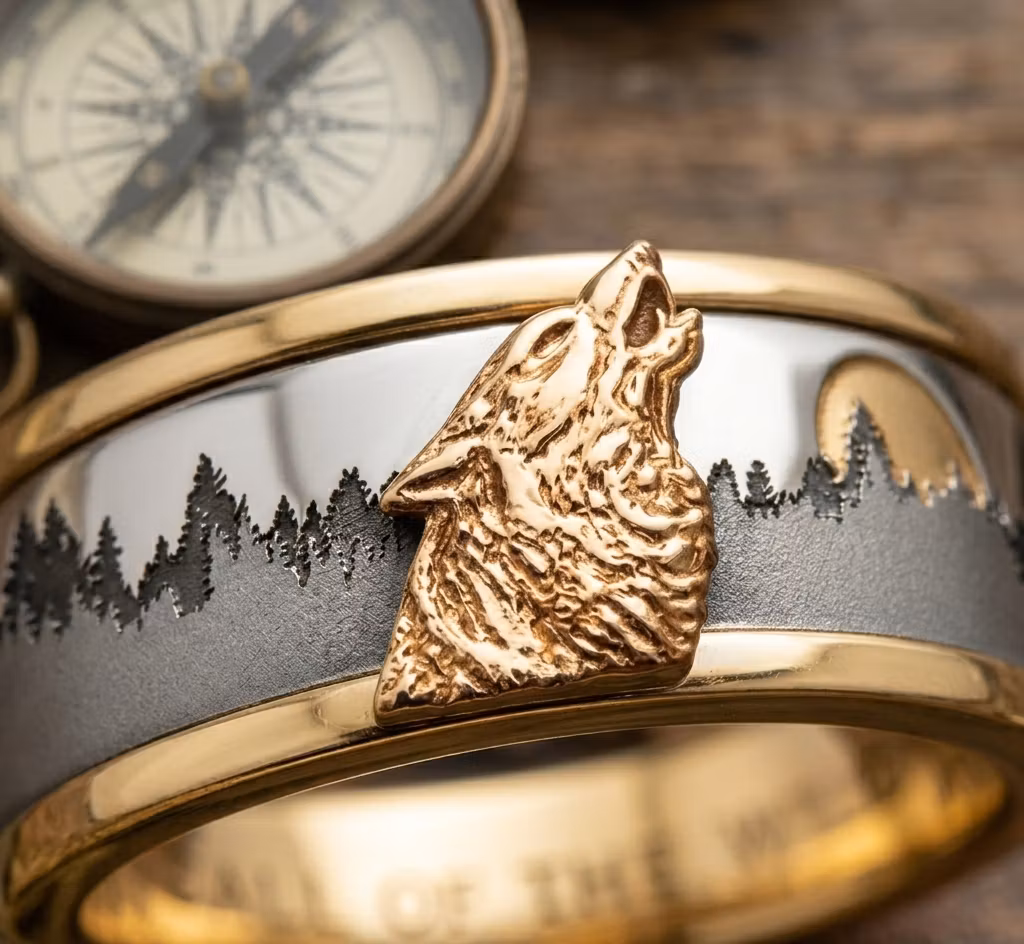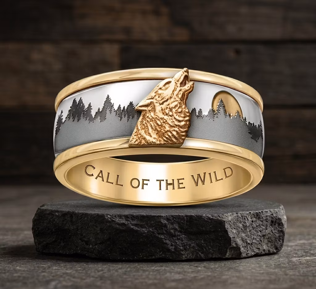 Ringen har en slående kontrast mellan guld- och silverfinish. Det centrala motivet pryds av ett upphöjt, gyllene varg-huvud som ylar mot skyn, omgivet av en graverad siluett av en tät granskog. Som en hemlighet för bäraren är insidan av ringen djupt graverad med texten "CALL OF THE WILD".