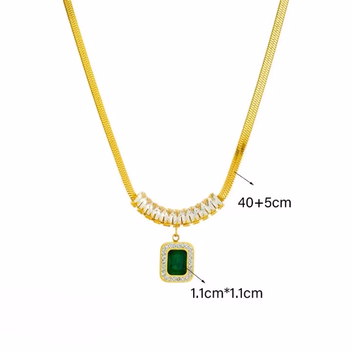 Setet består av ett matchande halsband, armband och örhängen. Den centrala designen fokuserar på en kvadratisk, smaragdgrön sten omgiven av en ram av gnistrande, klara zirkoner. Halsbandet har en modern "Snake Chain"-design som ligger mjukt mot huden och ger en omedelbar touch av lyx vid varje tillfälle – från festliga galor till vardaglig elegans.