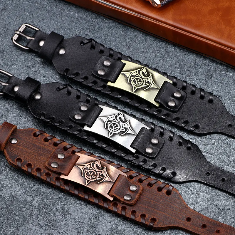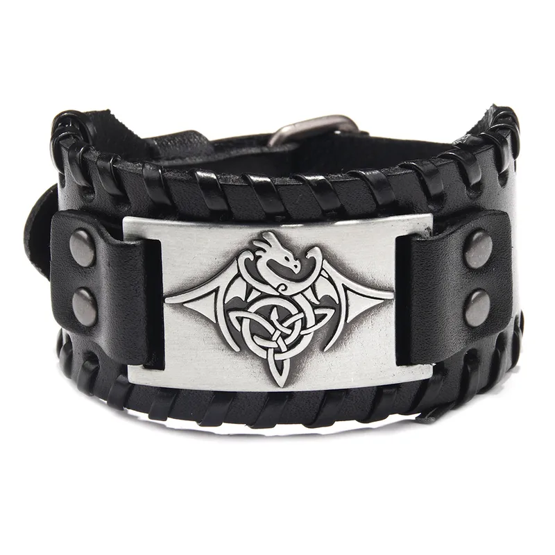 Armbandet är konstruerat av brett, högkvalitativt läder med snygga flätade kantdetaljer som ger en genuin hantverkskänsla. Centralt sitter en robust metallplatta med ett intrikat mönster som föreställer en drake omgiven av keltiska knutar. Draken symboliserar makt och beskydd, medan de eviga knutarna representerar livets sammanvävda stigar.